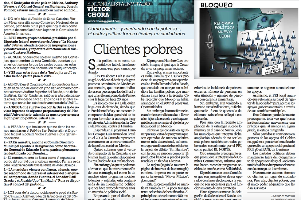 Clientes PobresVictor Chora30 jul 20181 Min. de lecturaPor Victor ChoraPublicado en el periódico EL NORTE el 17 de junio de 2014#PobrezaMx #CruzadaHambre #HambreCero #Sedesol